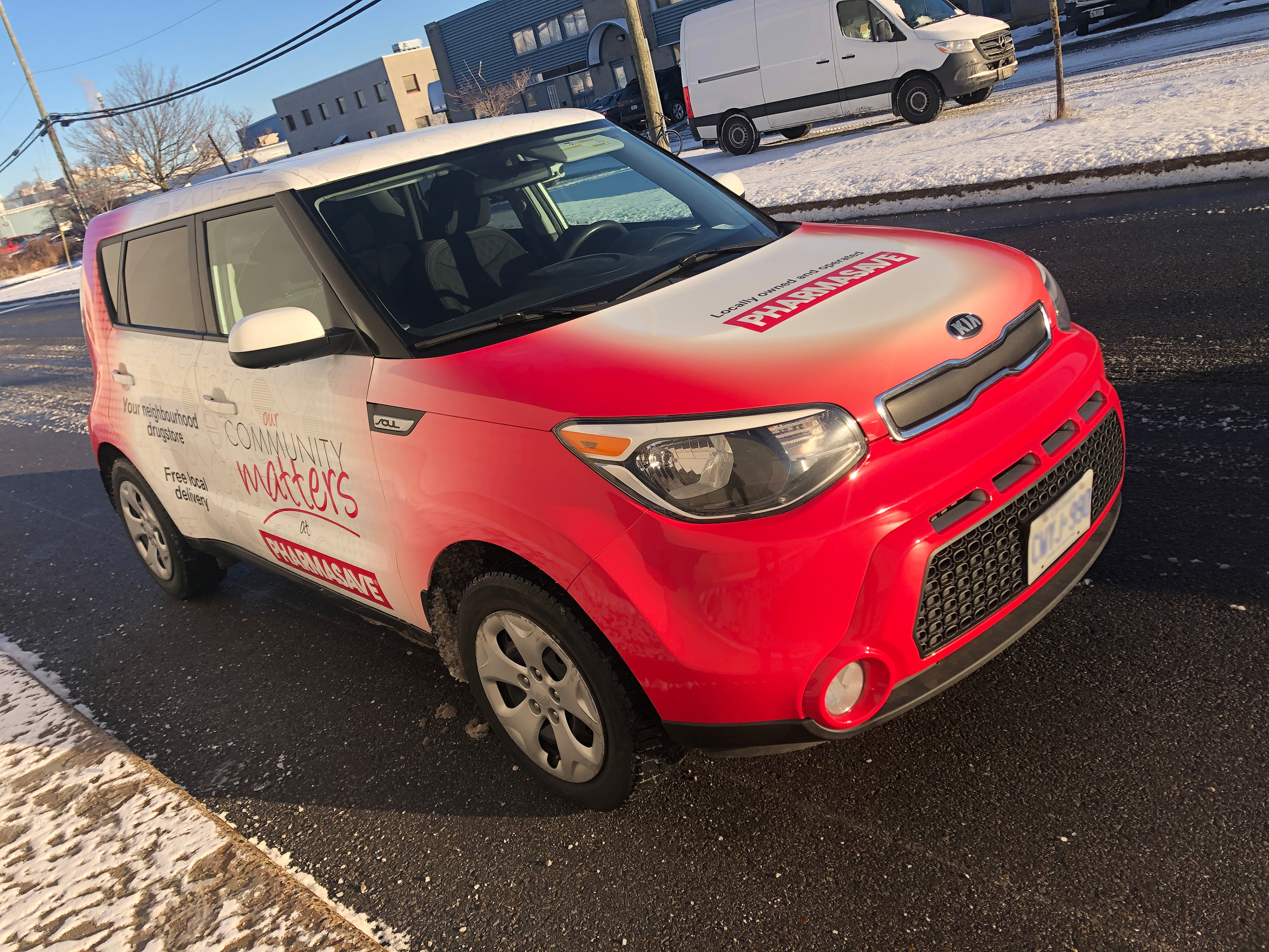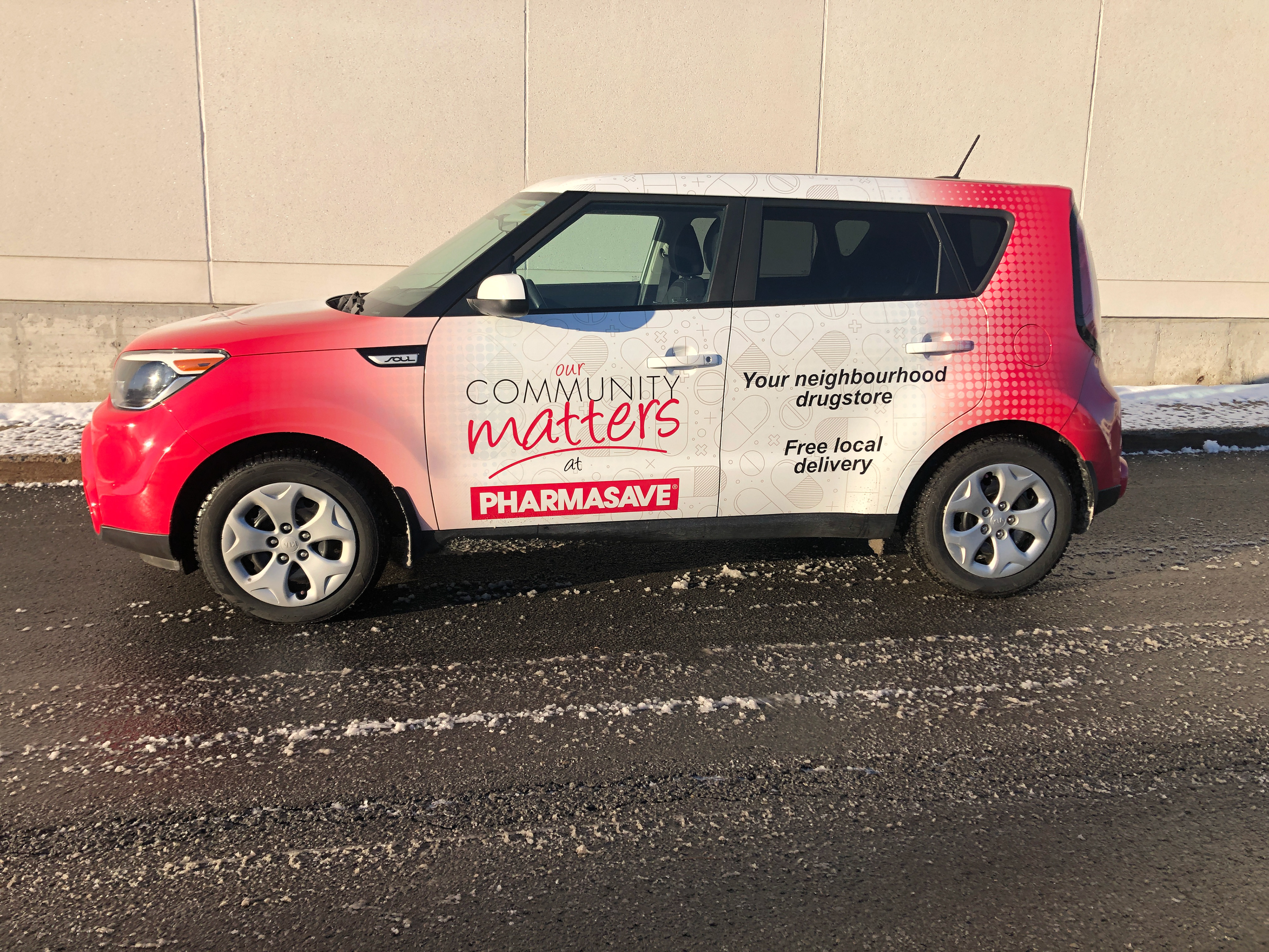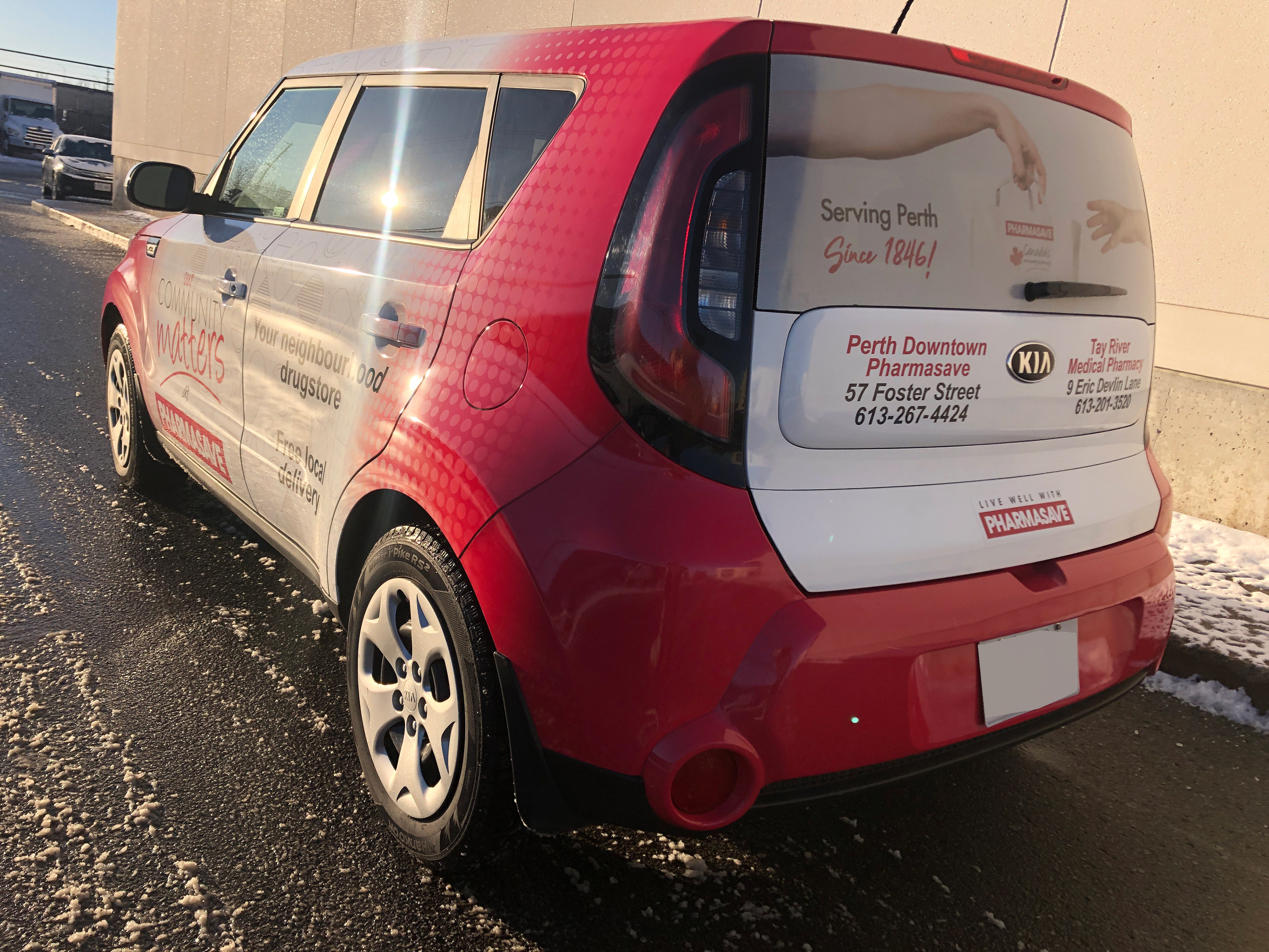 A wrap designed for a locally owned pharmacy in Perth, just a few hours outside of Ottawa. A seamless pattern and gradient going all the way around the vehicle.